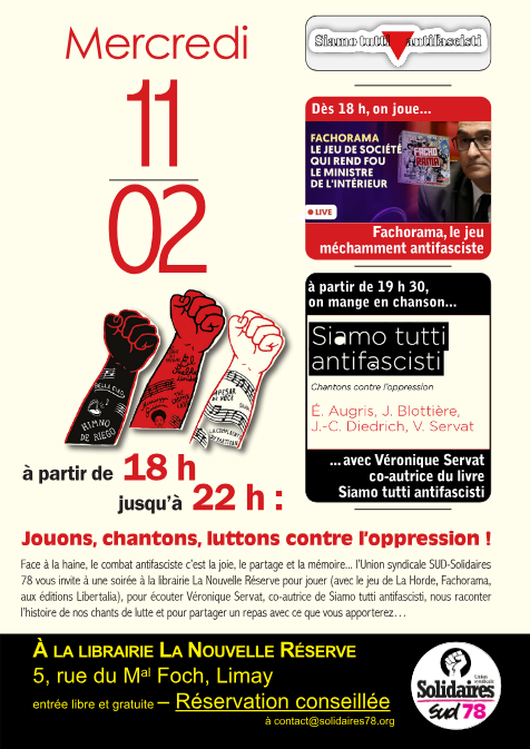Catégories (re)Penser notre syndicalisme Actu Solidaires 78 antifascisme Soirée Siamo tutti antifascisti – Limay mercredi 11 février Auteur de l’article Par Solidaires78 Date de l’article 1 février 2026 Une soirée rencontre Jeux – Chansons – Repas partagé organisée par l’Union syndicale Solidaires 78.Please follow and like us: ← Programme accueils et rencontres Solidaires 78 janvier-février 2026