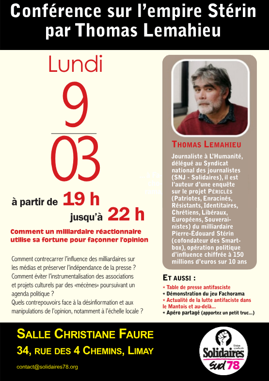 L’Union syndicale Solidaires rappelle qu’elle combat syndicalement l’extrême droite et ses idées : absences de libertés publiques, désignation de boucs émissaires, racisme, antisémitisme, xénophobie, homophobie, transphobie…Tant par son projet politique au service du patronat que par sa volonté de semer la division et la haine, l’extrême droite est l’ennemie des travailleurs et travailleuses qui doivent s’organiser pour la combattre. L’extrême droite est par ailleurs l’ennemi des travailleurs·euses avec une politique au service du patronat.
