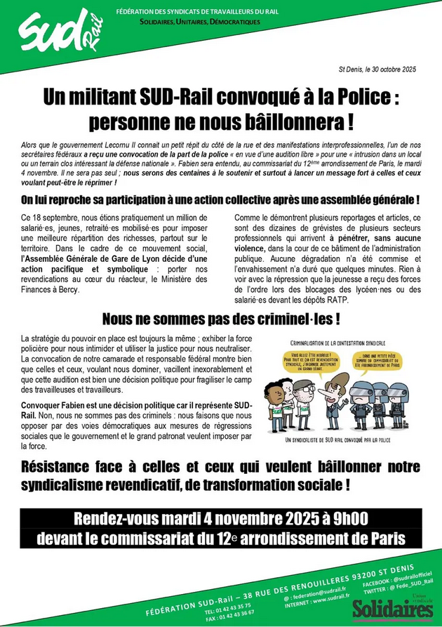 Notre camarade Fabien Villedieu, secrétaire fédéral de SUD-Rail, est convoqué au commissariat du 12ème arrondissement ce mardi 4 novembre à 9h00 à la suite de l’action menée au Ministère des Finances le 18 septembre dernier, journée de grève interprofessionnelle.