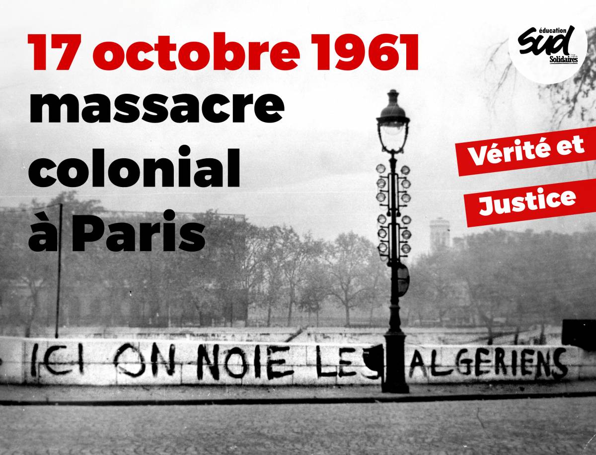 SUD éducation appelle à se joindre aux commémorations et aux rassemblements du 17 octobre partout en France afin de rendre hommage à la mémoire de tou.te.s les Algérien-ne-s qui ont été victimes des violences racistes et colonialistes de l’État français !