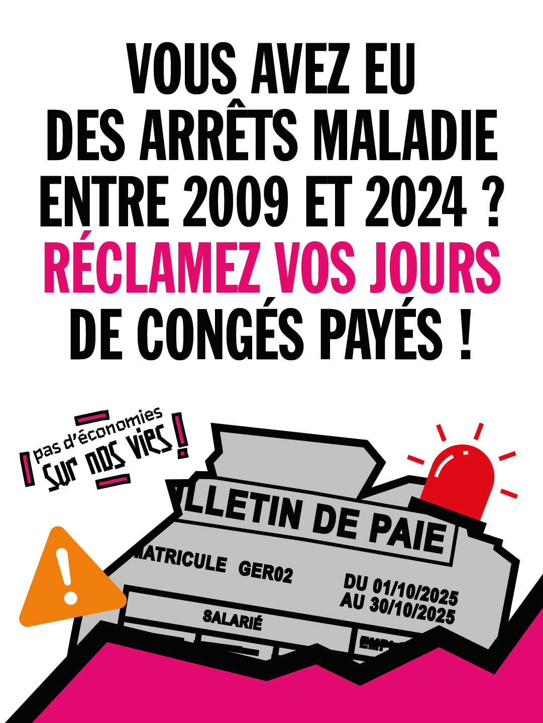 Depuis avril 2024, les salarié·es du secteur privé peuvent acquérir des congés payés durant leurs périodes d’arrêt maladie. Ils et elles peuvent remonter jusqu’en décembre 2009 pour réclamer des rappels de congés payés. Les salarié·es génèrent donc 2 jours de congés payés par mois d’arrêt maladie (et non pas 2,5jours…). Sur des salarié·es ayant eu de nombreux arrêts de travail, ou des arrêts de longue durée cela peut représenter des sommes de plusieurs milliers d’euros. Les salarié·es en affection longue durée (ALD) qui peuvent arrêt maladie de plus de 3 ans, y sont particulièrement exposé-es. Malgré la loi très claire, énormément d’employeurs préfèrent jouer la montre et ne pas payer ces rappels de congé payé. Or à compter du 22 avril 2026 il ne sera plus possible de remonter jusqu’en 2009, mais seulement 2 ans en arrière. Il est donc absolument nécessaire de saisir les Prud’hommes avant cette date butoir. Contactez votre Union départementale ou locale !