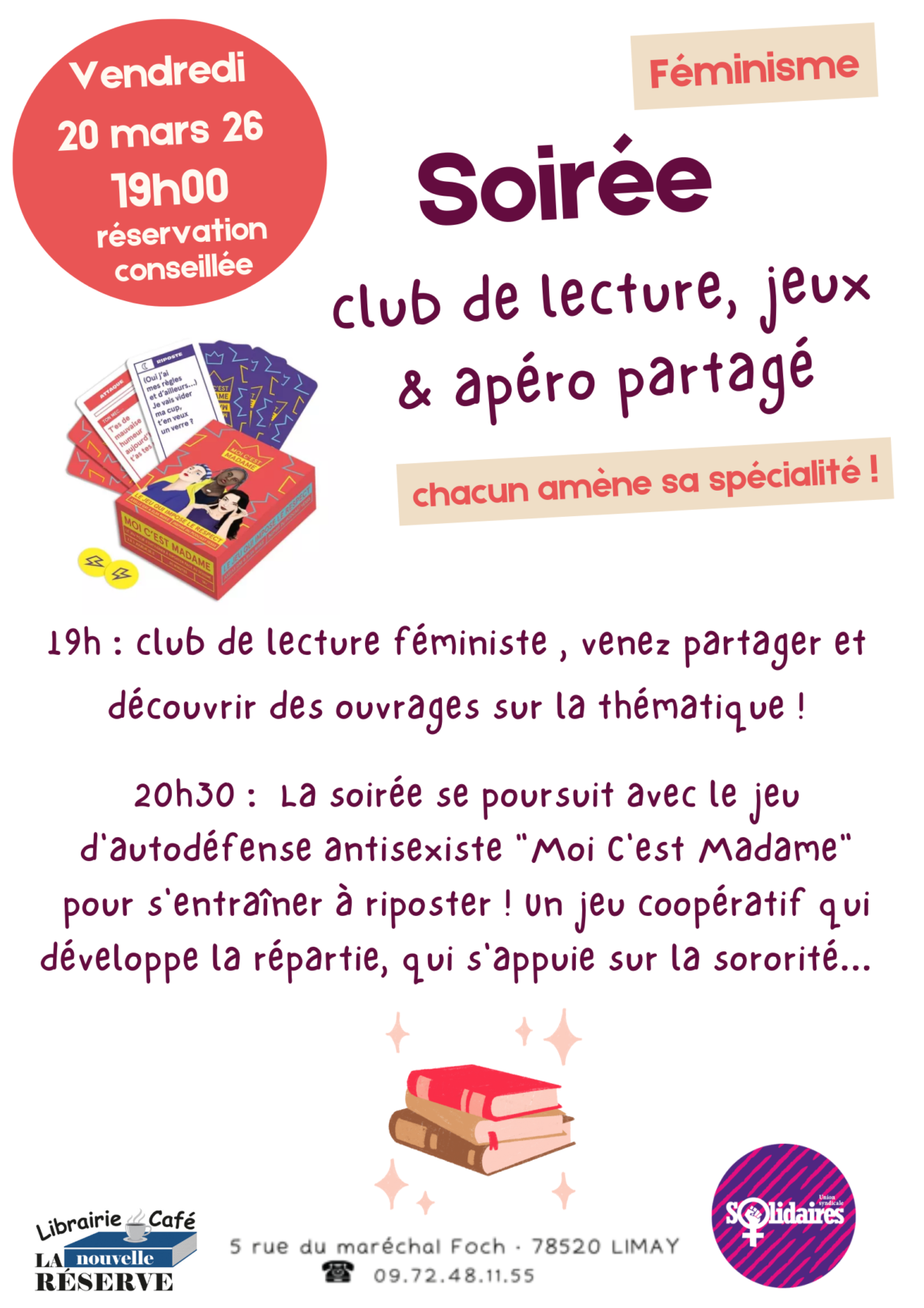 Catégories (re)Penser notre syndicalisme Accueils Solidaires 78 Actu Solidaires 78 Agenda militant Contre la transphobie ! Luttes contre la Lgtbqia+ - phobie Luttes contre les discriminations Luttes féministes Vendredi 20 mars – Soirée féministe : lectures et jeu à Limay Auteur de l’article Par Solidaires78 Date de l’article 15 mars 2026 Co-organisée avec la librairie la Nouvelle réserve et Solidaires 78 A partir de 19 h à la librairie La Nouvelle Réserve, Limay Entrée libre et gratuite Please follow and like us: ← Mardi 24 mars – Accueil syndical Solidaires 78 : cycle autogestion