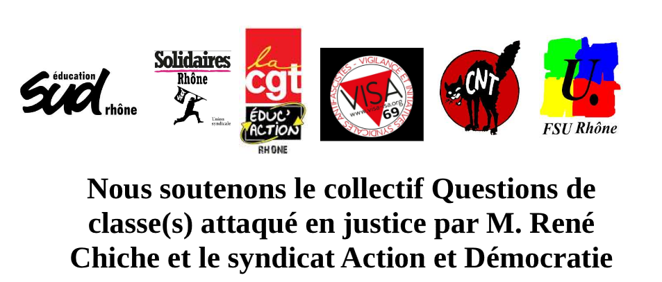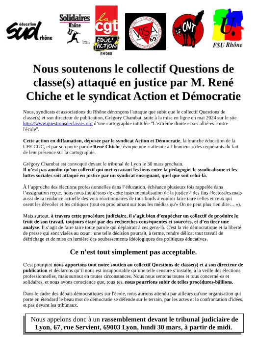 Le Collectif Questions de Classe(s) est attaqué en justice à travers une plainte de René Chiche (Action & Démocratie – CFE-CGC) contre son directeur de la publication, notre camarade Grégory Chambat, par ailleurs syndiqué à Sud Éducation en région parisienne, pour une cartographie de l’extrême-droite et ses alliés dont nous recommandons la lecture.