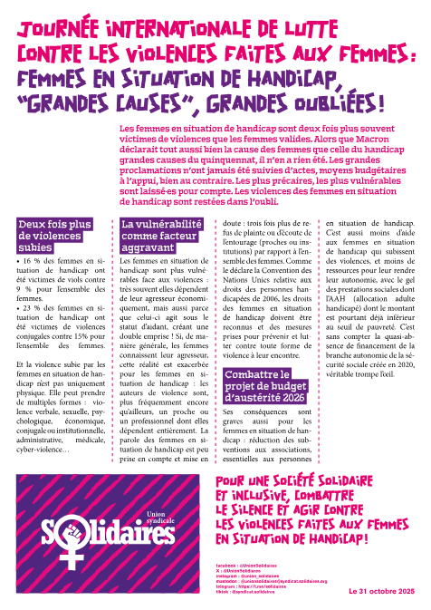 25 Novembre 2025 Journée internationale pour l’élimination de la violence à l’encontre des femmes Contre le patriarcat Ni oubli, ni silence Marchons contre les violences ! Pour la journée internationale de lutte contre les violences faites aux femmes du 25 novembre, nous manifesterons en solidarité, comme nous l’avons déjà fait le 11 octobre, avec et… afficher en ligne. |